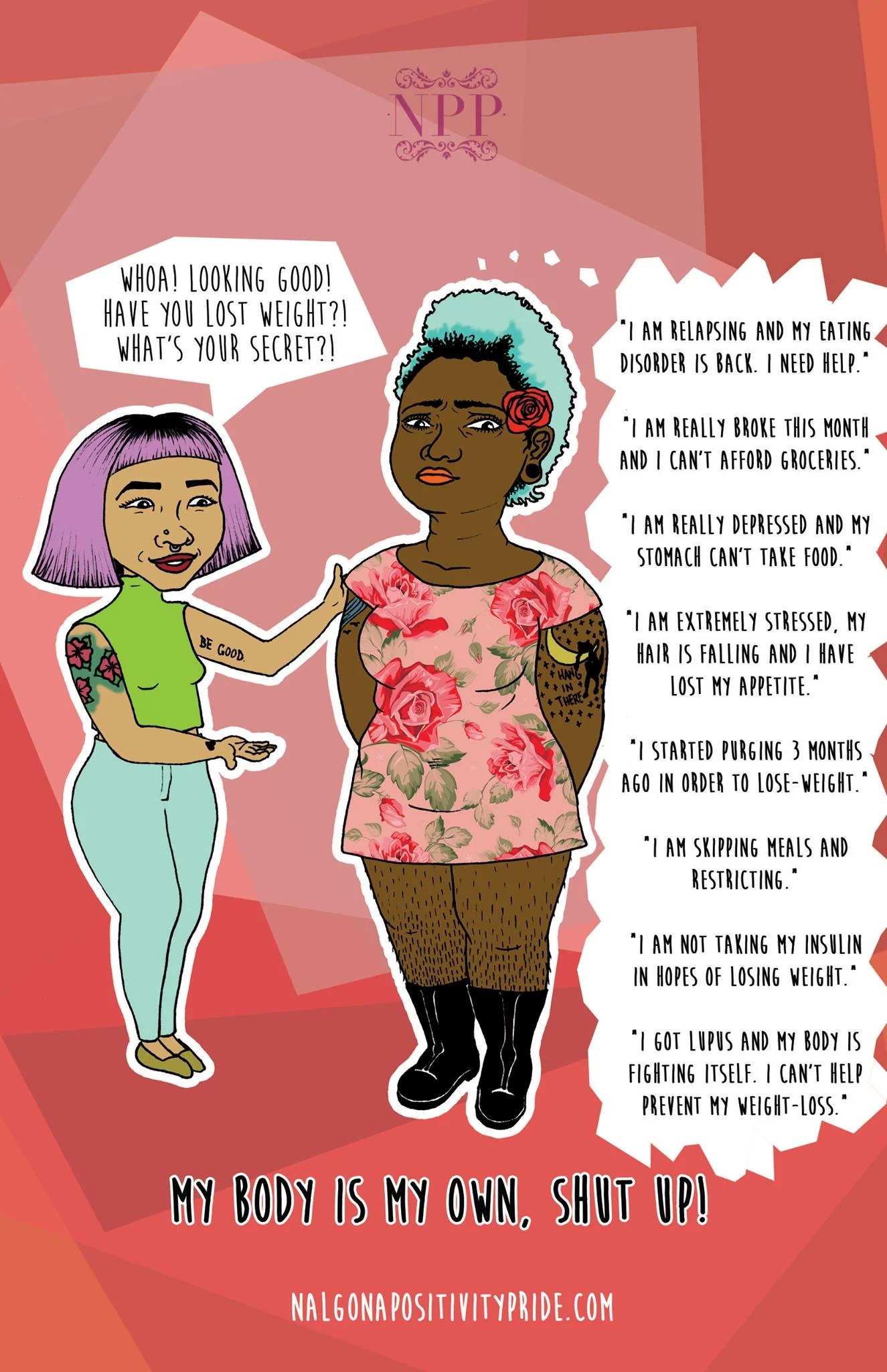 - BODY IMAGE CONVERSATIONS: If the conversation turns to body image/weight/diets/physical appearance etc.; have prepared a few assertive lines to say if you need to. REMEMBER: YOU ARE NOT OBLIGED TO TELL ANYONE ABOUT YOUR MEDICAL/MENTAL CONDITION.